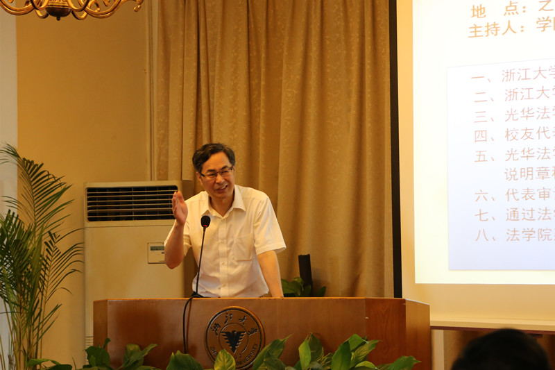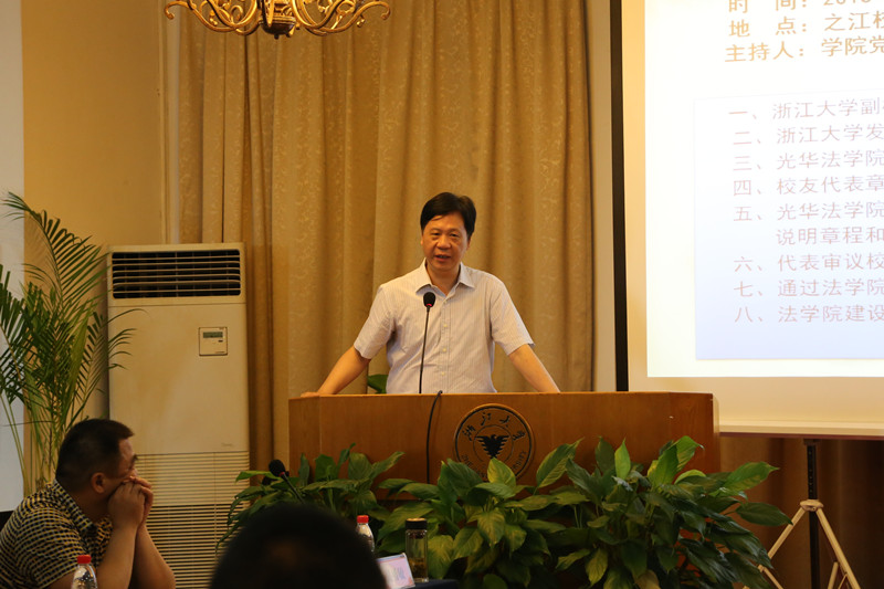 院党委副书记吴勇敏汇报了成立光华法学院校友分会的情况、章程、组织架构,指出院校友会是自愿组成的联谊性、非营利性的群众组织,是浙大校友会的分支机构。宗旨是热爱祖国、热爱母校、广泛联络和凝聚校友,加强法学院与海内外校友之间的联系,支持和服务广大校友,搭建校友沟通的桥梁,共谋母校、母院的发展大业,为建设社会主义和谐社会做出贡献。浙江大学发展联络办公室主任胡炜也向与会校友介绍了校友分会成立的重要意义,在加强学校、学院与校友联系的同时,服务校友、服务学院、服务学校、服务社会。随后,与会校友对光华法学院校友分会章程、理事会组织结构和组成人选进行审议,顺利通过了法学院校友分会章程和第一届理事会成员。