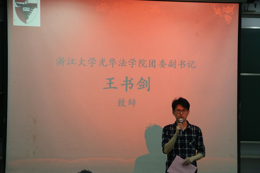 在主持人短暂的开场白后,光华法学院团委副书记王书剑老师上台发表了精彩的致辞。王老师为我们回顾了法文化月厚重的发展历程,对热情参与的同学与辛勤工作的工作人员都表示了感谢。随后,光华法学院学生会主席助理何羽浓同学也对本届法文化月的各项活动做了生动的总结。