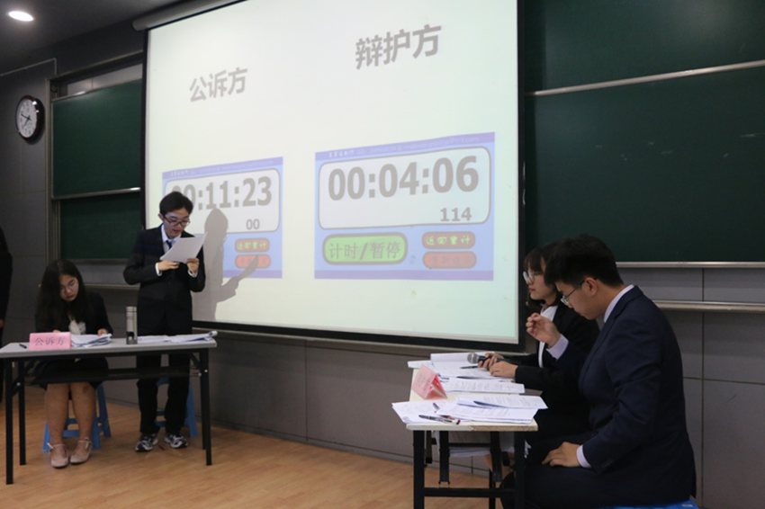 全真模拟法庭决赛随后拉开了序幕。本次庭辩分为双方陈述、自由答辩、陈词总结和评委点评四个环节。在15分钟的双方陈述环节后,两支决赛队伍:公诉方法里法气队、辩护方开心队就具体案情进行了激烈的法庭辩论,公诉方对直接证据与间接证据两者何者能作为裁判依据的问题对辩护方进行提问,辩护方则从我国司法实务出发巧妙回击。辩护方又对公诉人的举证责任提出疑问,公诉方则以建立物理模型的形式,运用牛顿第二定律指出受害人所受危害之大。双方在一招一式、你来我往间碰撞出思维的火花,引得在场观众啧啧称叹,频频鼓掌,掀起了闭幕式的高潮。