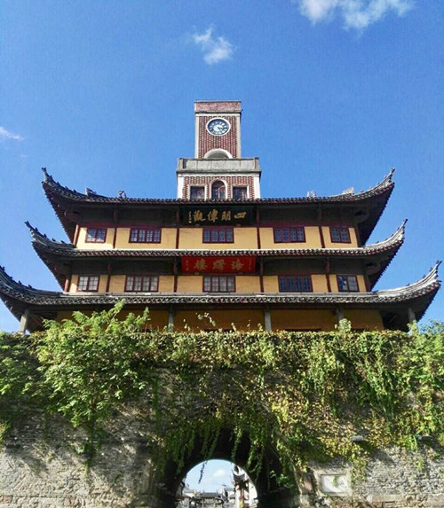 中午11:30,实践团队来到了宁波的另一处著名古迹——鼓楼,宁波鼓楼可谓是东西方文化交流的典范。其下部是典型的中国传统城楼样式,城楼上建的却是罗马风格的西式钟楼。走进鼓楼步行街,映入眼帘的则是西方的牛排与东方的火锅、西方的面包与东方的包子比邻而居,共同迎接着来自五湖四海的游客们。鼓楼以其开放包容的精神接纳了东西方不同文化。万千色彩汇聚于此,也造就了她延续千百年的盛名繁华。