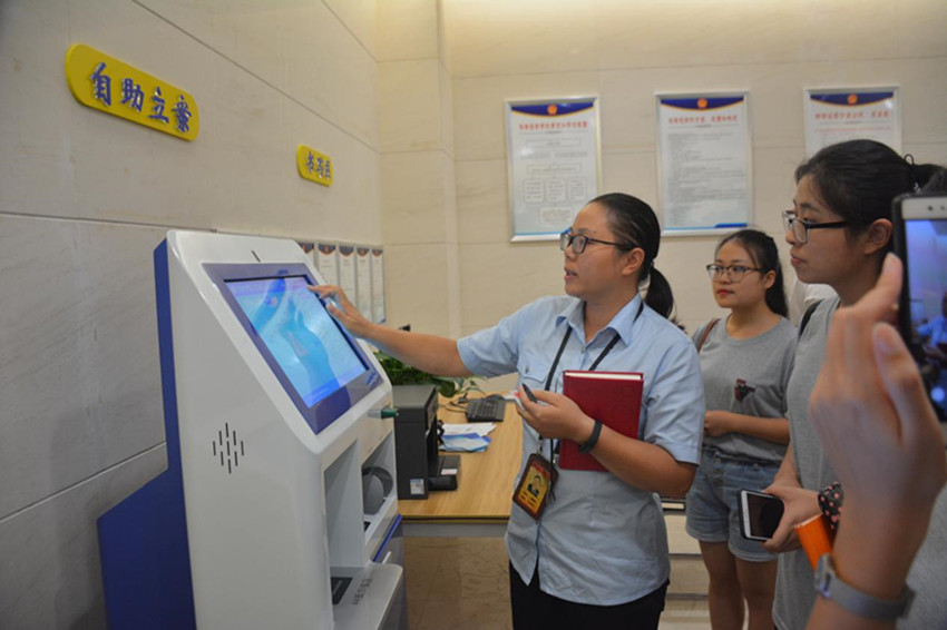 座谈会上,刘法官为我们讲解了她所主管的网上立案的发展现况。当下省高院部署的“大立案、大服务、大调解”三大机制建设工作正如火如荼地开展。为响应工作号召,宁波中院采取了大量举措。如在法院内部设立诉讼服务中心、在乡镇司法所设立自助立案机,为当地人提供打印案件受理通知书。此外还有智慧法院、网上立案平台等电子渠道,极大地为乡镇及偏远农村当事人提供便利。讲解完毕后,刘法官带领实践团队前往专设的“智慧法院区”进行现场观摩。该区域分为网上立案区、法律法规查询区、自助立案区、书写区四部分,配备专用的电脑与电子屏,可谓科技与便民相结合的良好典范。