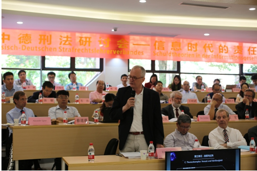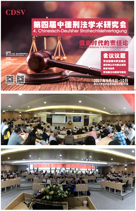 2017年9月9日至9月10日,第四届中德刑法研讨会在浙江大学光华法学院隆重举行,本次会议的主题是“信息时代的责任论”,由国家“2011计划”司法文明协同创新中心、浙江大学光华法学院、中德刑法学者联合会(CDSV)共同主办,由浙江靖霖律师事务所协办,由浙江大学光华法学院互联网法律研究中心承办。德国维尔兹堡大学埃里克•希尔根多夫教授、法兰克•皮特•舒斯特教授、卡斯特恩•库什教席助理、约肯•费德勒教席助理,德国科隆大学托马斯•魏根特教授,德国波恩大学乌尔斯•金德霍伊泽尔教授,德国奥登河畔法兰克福大学简•约尔登教授,德国刑事法律师协会亚历山大•伊格纳会长,北京大学法学院陈兴良教授、梁根林教授,清华大学法学院张明楷教授、周光权教授,中国人民大学法学院谢望原教授、冯军教授、付立庆教授、王莹副教授、陈璇副教授,中国社会科学院法学研究所邓子滨研究员、樊文副研究员,中国社会科学院大学何庆仁教授,北京航空航天大学孙运梁副教授,东南大学法学院刘艳红教授,南京师范大学法学院蔡道通教授、姜涛教授,复旦大学法学院杜宇教授,华东政法大学法学院于改之教授,华东师范大学法学院钱叶六教授,苏州大学法学院王昭武教授,西北政法大学法学院付玉明副教授,暨南大学法学院杨萌教授,浙江大学光华法学院周江洪教授、叶良芳教授、高艳东副教授、王钰博士、李世阳博士等学者受邀参加本届会议。本届会议由中国人民大学法学院陈璇副教授,维尔兹堡大学刑法学教席助理黄笑岩先生、梁奉壮先生,南京大学法学院徐凌波副研究员,天津大学法学院李倩博士,北京大学国际法学院曹斐博士,浙江大学光华法学院王钰博士等担任翻译。现场还吸引了众多旁听者,整个会场座无虚席。
