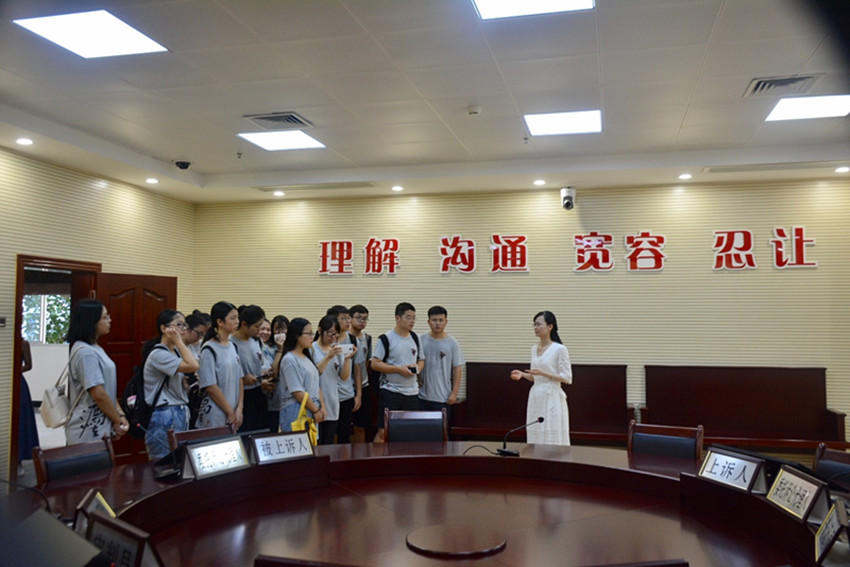 走出诉讼服务中心,我们穿过绘有泉州民俗画的文化长廊,来到一面古色古香的牌坊前。陈书记介绍,这是中院设立的家事法庭。家事法庭的康法官,向我们解释了设立家事法庭的初衷。目前我国还未有专门的家事诉讼法,家事案件又与普通的民事案件有些不同,家事诉讼不仅影响到家庭的和谐,对社会的安定也会造成一定的影响。因此泉州中院在遵守民事诉讼法的基础上加以探索,创新地引入心理辅导、情绪安抚等方法,设立了家事法庭。康法官引我们走进充满着温馨气息的审判庭,这里的审判席一改其高高在上的传统,而是与原被告席一起,同在一张圆桌上。康法官说,这是为了拉近法官与当事人、当事人之间的距离,同时也能舒缓当事人的情绪,使家事案件能够找到更加理智的解决方法。