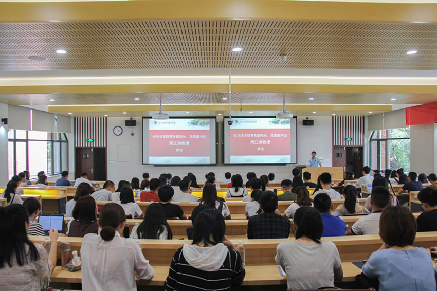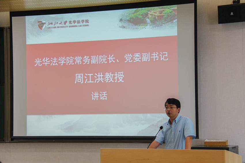 开学典礼在雄壮的国歌声中正式拉开帷幕。光华法学院常务副院长周江洪教授为新生带来题为“科技综合革命背景下的法学使命”的精彩发言。他以法律与科技的辩证关系为出发点,结合杭州作为科技综合革命前沿城市的特点,综合目前弱人工智能背景的时代需求,剖析科技创新中法律监管和司法运转智能化等学科前沿问题。周江洪教授说,我们目前所处的时代,极度的透明性与极度的匿名性并存的网络世界带给我们冲击,大数据和人工智能的运用,也带来了司法权运转的智能化。在这个弱人工智能起步的时代,研究生应当谨记“学习、实践、研究”六字:首先要博览群书,在学习中发现自我、超越自我,其次是要去实践,在实践中感受世界,发现真实的中国,追寻人生的责任和担当,最后,从阅读和实践中归纳出我们需要研究的命题,提炼中国特色法律问题,助推实践的深化和拓展,为中国特色法治理论体系建设贡献知识、勇担重任。