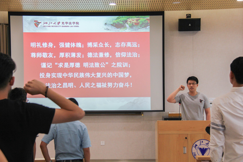 “明礼修身,强健体魄;博采众长,志存高远;尊师敬友,厚积薄发;德法兼修,信仰法治;谨记‘求是厚德 明法致公’之院训;投身实现中华民族伟大复兴的中国梦,为法治之昌明、人民之福祉努力奋斗!”光华法学院研究生会主席赵时康带领全体新生庄严宣誓。最后,在浙大校歌声中,新生开学典礼圆满结束。愿光华法学院每位2017级研究生新生谨记院训,亮出作为一个法律学子的大气,勇敢地迎接每一次的挑战,为创建一流大学法学院而共同努力。