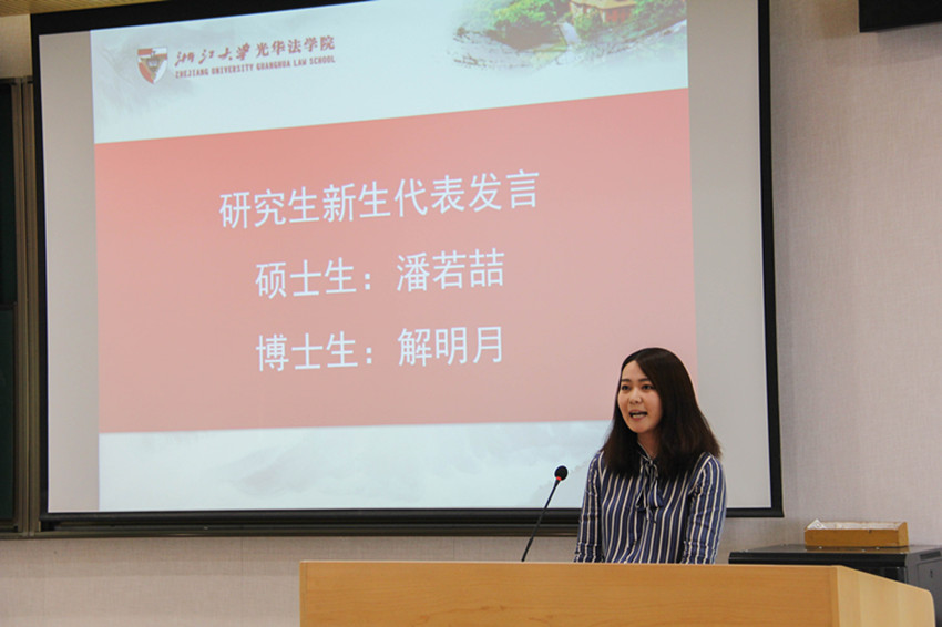 研究生新生代表潘若�在发言中对竺可桢老校长的两个问题进行了回答,并阐述了对院训“求是厚德,明法致公”的理解。他表示既要惜时如金、孜孜不倦,下一番心无旁骛、静谧自怡的功夫,又要突出主干、择其精要,努力做到又博又专、愈博愈专。博士生新生代表解明月说,自己对光华法学院的向往始于在美国伊利诺伊大学求学时,如今有幸成为光华法学院的一员,定当以竺可桢老校长和李浩培院长等诸位先贤为标杆,不辜负这月轮山水。