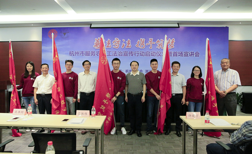 9月21日上午,浙江大学和杭州市总工会联合举行的“尊法守法·携手筑梦”服务农民工法治宣传行动暨首场宣讲会在杭州举行。浙江省教育工会副主席邓飞虎、杭州市总工会副主席张明、浙江大学工会常务副主席楼成礼参加启动仪式并为志愿者服务分队授队旗。活动由杭州市总工会法律工作部部长袁野主持。浙大工会副主席林俐,浙大党委宣传部副部长卢军霞,浙大团委副书记卓亨逵,浙大光华法学院党委副书记吴卫华,杭州市总工会法律工作部副部长顾越蓉,杭州高新区(滨江)总工会党组书记、常务副主席王利君,副主席李星跃,浙大师生志愿者及百余名农民工等出席了启动仪式。