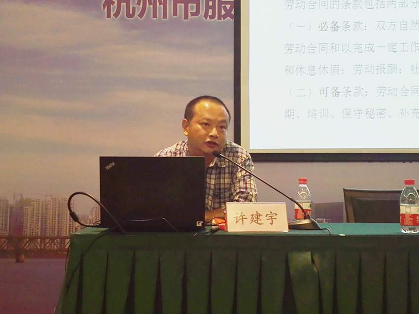 启动仪式后,浙江大学光华法学院副教授、硕士生导师许建宇带来题为“农民工的权益保护”的普法讲座。许建宇老师在劳动法学领域有着丰硕的研究成果和丰富的实务经验,他从劳动合同、工资、工伤保险、劳动争议处理四个方面展开,对农民工所关心的书面劳动合同订立、工资标准、欠薪、工伤认定、劳动争议冲裁和诉讼的注意事项等问题做了详细的介绍。许建宇老师将明确的法律规定与具体的事例相结合,并在讲授中辅之以图标,给在场的农民工带来了一场生动、细致、实用的普法课。