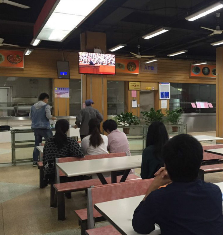 班团支部组织学生在食堂观看十九大开幕式