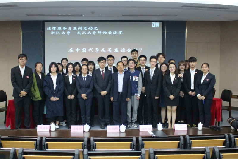 2017年11月10日,由浙江大学光华法学院主办、浙江大学学生法学研究会承办的“六和杯”浙江大学—武汉大学辩论交流赛于浙江大学紫金港校区国会138举行。双方就“在中国代孕是否应该合法化”展开精彩纷呈的辩论交流,为两校更为长久的友谊打下坚实的基础,双方辩手的机智、幽默博得了在场观众的满堂彩。