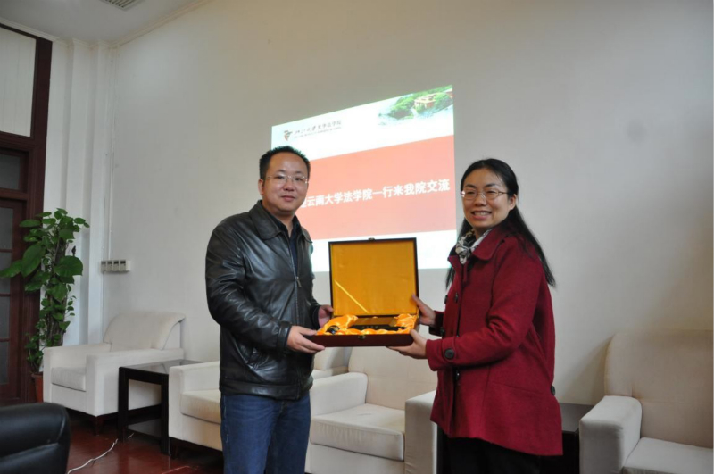观看完学院宣传片后,吴老师介绍了学院行政系统的组织构架并从法学院的常规工作、团建党建以及特色活动三个方面梳理了辅导员的日常事务。云南大学法学院的辅导员制度与我院略有不同,在同设定团委书记与辅导员的制度下,云南大学采取的是分任制度,团委书记与辅导员各司其职。因此,在听完吴老师的介绍后,云南大学分管团委工作的老师专门就学生社团的人员设定、学生协助办会制度、行政经费管理制度等问题与我院教师展开深入的交流。会议临近尾声之时,吴老师送上带有法学院特色的学院纪念品以表对云南大学思政教师团队的欢迎之意。