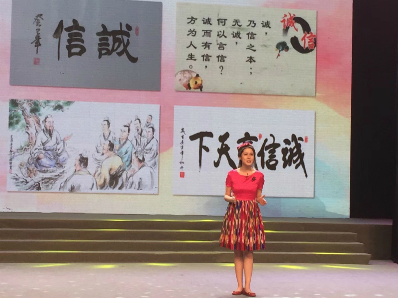 娜扎开提的演讲题目是《反身而诚 乐莫大焉》。她从切身经历出发,向大家展现了诚信对群体、民族甚至国家形象的重要影响。只有立足诚信,中华民族才能在世界上树立起正面的形象,才能更加接近伟大复兴的中国梦。她以真情实感征服了在场的评委和观众。