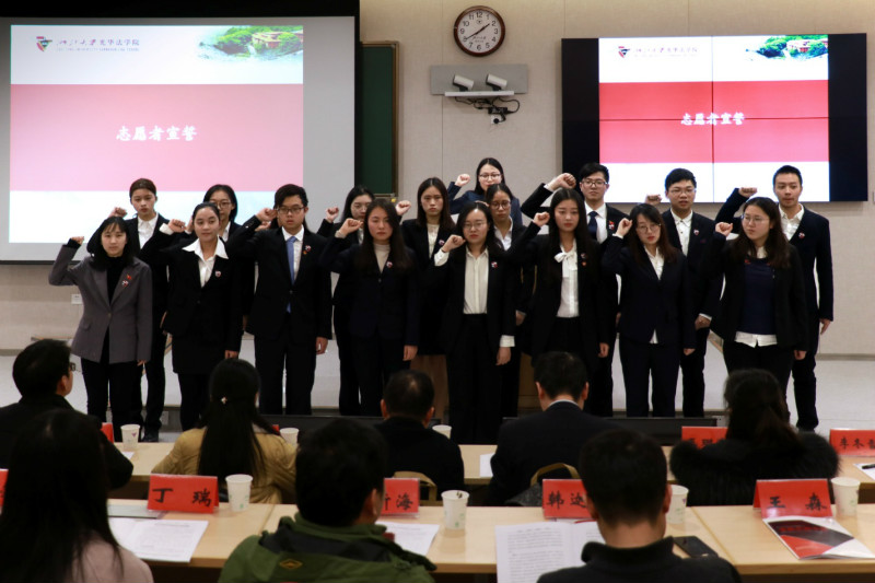 中心第一届主任团成员余雅蓉上台做工作报告。在过去一年,中心在制度创建、志愿者招募和培训、提供法律援助、开展普法宣传、社会调研等方面都取得丰硕成果。在新加入志愿者们的热烈掌声中,校党委研工部陈凯旋老师、校团委吴李鸣老师、学院党委吴卫华老师、学院团委李冬雪老师上台为志愿者佩戴徽章,这是一种嘱托,也是一种期盼。志愿者代表何羽浓同学带领志愿者们举起右手庄严宣誓,全场掌声雷动。