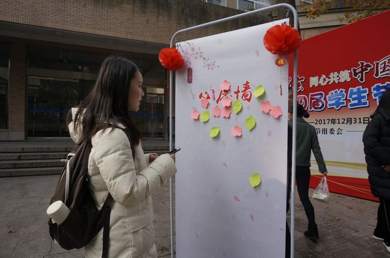 除了福袋和春联,立在边上的新年心愿墙也十分夺人眼球,贴满了五彩缤纷的纸条,上面承载的是同学们同样斑斓的新年愿景。