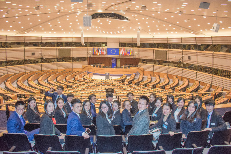 当天下午,考察团一行前往欧洲议会参观。欧洲议会位于比利时布鲁塞尔,是欧盟三大机构(欧盟理事会、欧盟委员会、欧洲议会)之一,为欧盟的立法、监督和咨询机构。欧洲议会工作人员乔治先生负责本次接待,他向同学们详细介绍了欧盟和欧洲议会的历史与现状,并带领同学们参观了欧洲议会办公大楼。乔治先生重点向同学们介绍了在决策过程中相关法规决议在欧盟委员会、欧盟理事会和欧洲议会之间进行流转审查的制定过程以及欧洲议会的议员投票制度等等。结束欧洲议会总体情况的讲解后,乔治先生带领同学们参观了欧洲议会的主会议厅,依照顺序讲解了会场各个区域的位置和功能。通过他的介绍,同学们加深了对欧盟和欧洲议会的认识,也对如何实现国际组织内部部门协作、不同国家之间的合作共赢有了更深的理解。