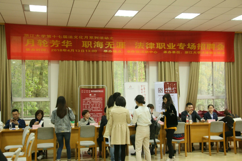 2018年4月13日,“月轮芳华,职海无涯—第十七届法文化月之法律职业专场招聘会”于浙江大学之江校区李作权活动中心开展。本次活动由浙江大学光华法学院主办,浙江大学法律硕士协会承办,旨在搭建优秀律所、企业和我院师生之间的信息交流平台,促进就业资源优质匹配。