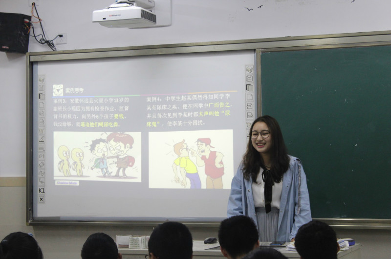 在学校相关负责老师的带领和各班班主任的引导下,志愿者们登上讲台开始相关法律知识的讲解。