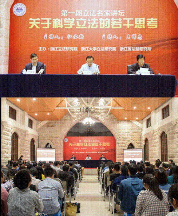 2018年4月19日晚,浙江立法研究院暨浙江大学立法研究院首期“立法名家讲坛”在浙江大学之江校区小礼堂顺利举行。“立法名家讲坛”是立法研究院的重要活动之一,旨在邀请立法领域最权威的实务与理论专家传经送宝,推动立法理论与实践的转型升级。首期“立法名家讲坛”主讲人为中国法学会副会长、中国法学会行为法学会会长江必新教授,主题为“关于科学立法的若干思考”。全国人大华侨委员会委员、省十二届人大常委会党组书记、副主任王辉忠主持本次讲坛。浙江大学副校长严建华致辞。最高人民法院行政审判庭、浙江省人民代表大会常务委员会法委、法工委、浙江省高级人民法院有关领导,浙江大学光华法学院常务副院长周江洪以及省属各高校法学院的师生代表,齐聚礼堂、共飨知识盛宴。