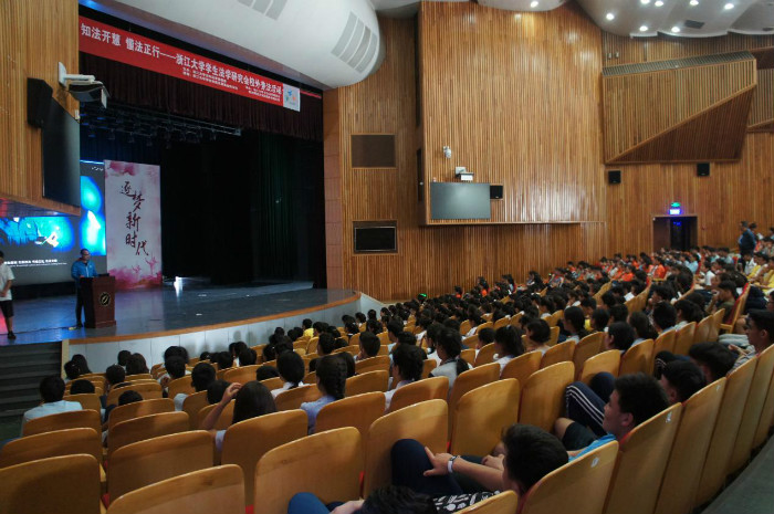 2018年5月11日星期五下午13:15,浙江大学第十七届法文化月系列活动之走进杭州师范大学附属中学(以下简称杭师大附中)普法活动在杭师大附中音乐厅举行。杭师大附中校长秦丽,浙江大学学生法学研究会(以下简称法研)成员,杭师大附中新疆部的部分老师和全体同学参与了本次活动。同时,也感谢浙江大学学生社团发展基金以及杭师大附中校方的支持。