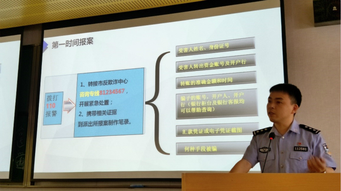 5月11日,浙江大学光华法学院2018年“先锋学子”全员培训计划第一课于曾宪梓楼203教室开课。培训内容分为二部分,观看《厉害了,我的国》纪录片,聆听安全教育讲座。学院团委书记李冬雪和团委副书记王书剑老师出席,同时邀请到九溪派出所何宏伟副所长及多位民警和之江校区保卫办主任章辉到课,为全体党员同志作关于防范电信网络诈骗的专题报告。