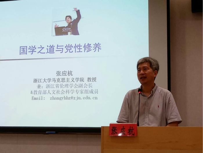5月18日,浙江大学光华法学院2018年“先锋学子”全员培训计划专题辅导报告第三讲于曾宪梓楼203教室开课。此次培训课程,邀请了马克思主义学院张应杭教授为党员同学们带来题为《国学之道与党性修养》的专题报告。学院党委副书记吴卫华老师主持报告,学院团委书记李冬雪老师、副书记王书剑老师等机关行政教工老师到场聆听报告。