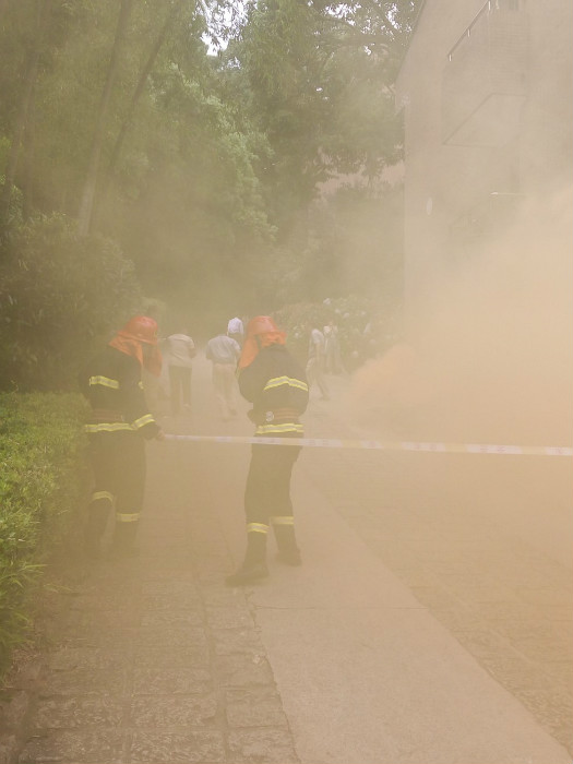 演习前20分钟,各相关部门进入演习指定地点并且开始相关准备。12点30分,演习正式开始。浓密呛鼻的黄色烟雾从11舍楼下涌出,伴随着消防演习警报的拉响,正在宿舍中的同学们纷纷拿出准备好的毛巾捂住口鼻快速有序地跑出宿舍,在11舍楼前的停车场上集合。与此同时,学院消防队快速打开消防栓、抛出水龙带,一切都顺利地按照预定方案进行。三分半钟后,所有的同学都安全撤离。