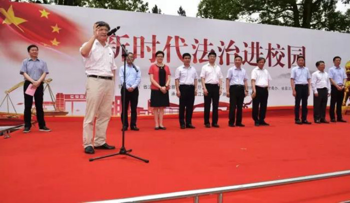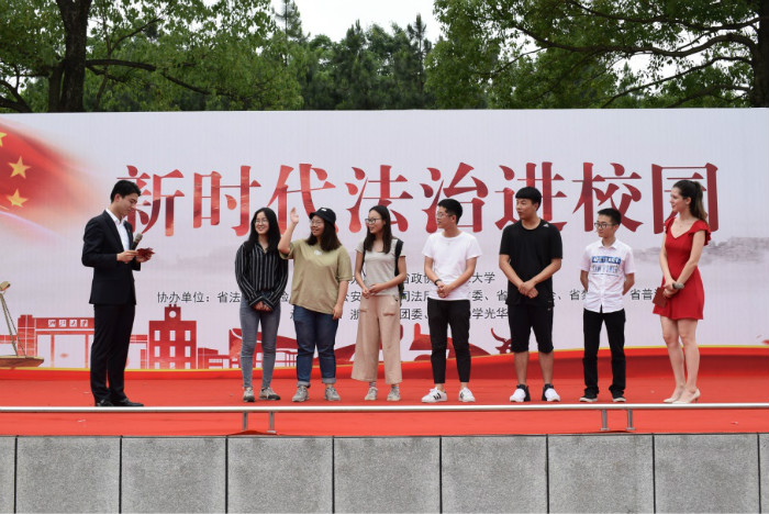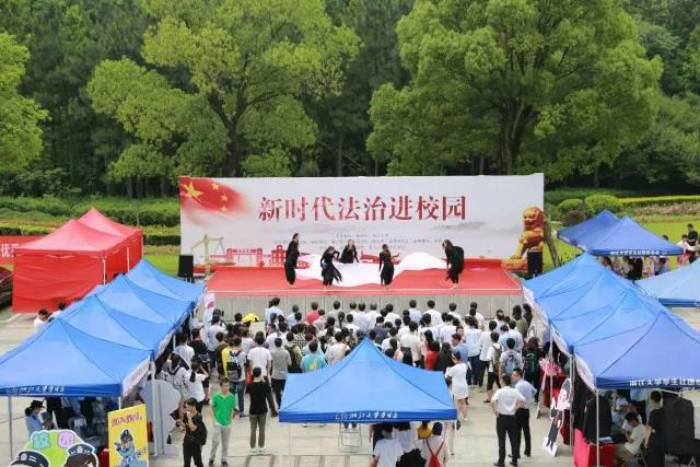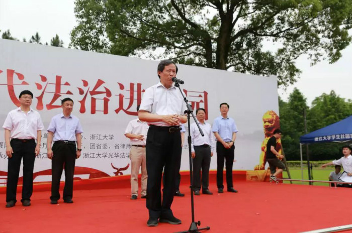 为弘扬中国特色社会主义法治精神,强化广大学生学法、尊法、守法、用法意识,助力“法治浙江”建设,同时积极响应党中央、国务院对“建设世界一流大学和一流学科”的重大战略决策号召,由省政协牵头,浙江大学光华法学院联合校团委共同承办的“新时代法治进校园”主题活动于2018年5月25日在紫金港盛大开启。浙江大学党委副书记郑强教授,省政协常委、社法委副主任、省纪委副书记罗悦明,省政协委员、社法委副主任、省法院副院长徐建新,省检察院副检察长黄生林,省公安厅副巡视员何建军,省司法厅副厅长劳泓,省政协常委、社法委副主任、民革省委会专职副主委刘净非,省政协常委、共青团与青联界别组组长、团省委副书记王征,省政协委员、省律师协会秘书长陈三联以及浙江大学相关单位负责人和师生代表共200余人参加活动。光华法学院常务副院长周江洪、党委副书记吴卫华、团委书记李冬雪出席了本次活动。活动邀请政协委员中的检察官、法官、律师等法律工作者走进校园、走进学生,开展《宪法》宣传、法律讲座、法律咨询、模拟法庭等系列活动,为师生提供了深入了解法律相关信息与法律职业工作者交流互动的机会。