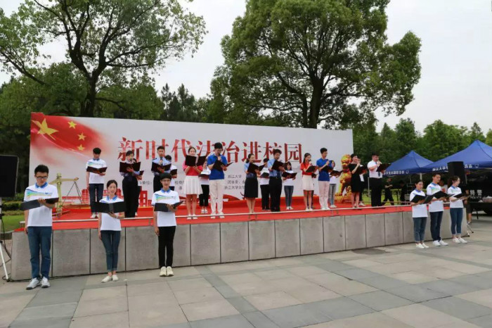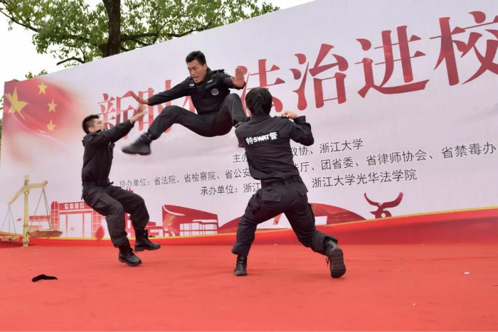 11:00至11:40,省政协“新时代法治进校园”活动启动仪式在紫金港校区文化广场如期举行。暖场环节由我们光华法学院的学子邢涵和娜扎开提主持。在我校学子活力四射的拉拉操表演、刚劲有力的中国传统武术表演后,省公安厅的警员们为我们带来气吞山河、势如破竹的格斗操表演,将现场的气氛推向一个小高潮,也为之后的环节奠定了庄重大气又不失青春昂扬的基调。