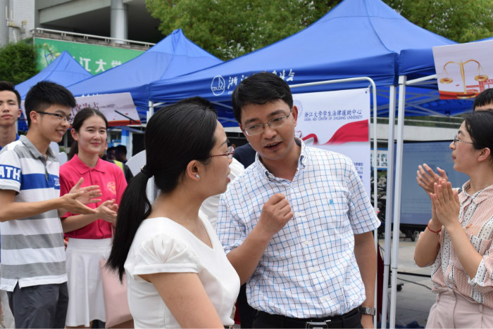而在舞台之下,种类繁多、别具特色的大型展示互动服务活动也热火朝天地展开。我院学生会工作人员负责法律职业体验营的项目,通过制服展列、知识解说、模拟互动等多样形式让参与者真切体验法律职业。浙江大学学生法律援助中心的校园法律援助咨询点,浙江大学法律硕士协会的社团展示棚,学生法学研究会组织的法律版真人大富翁也以轻松、活泼的形式宣传和普及法律知识,吸引了大量学生关注、参与。
