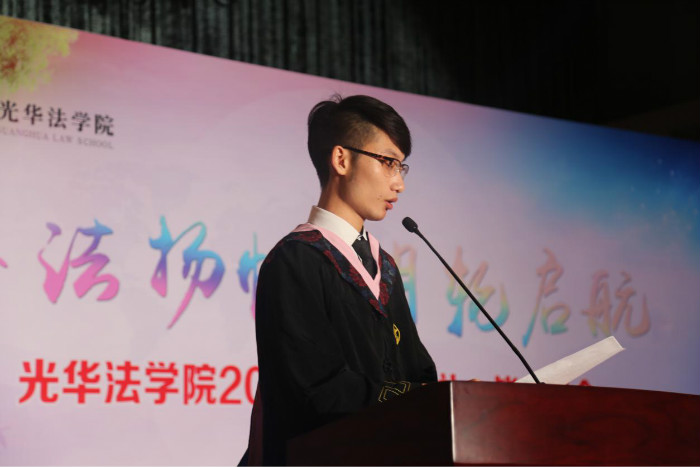 本科毕业生代表14级法学专业赵赫说,我们要不负光华法学院的培养,积极承担身为法律人的社会责任,投身奉献于我国法治社会建设之中,将个人发展与国家命运联系起来,维护法律权威,坚定理想信念。