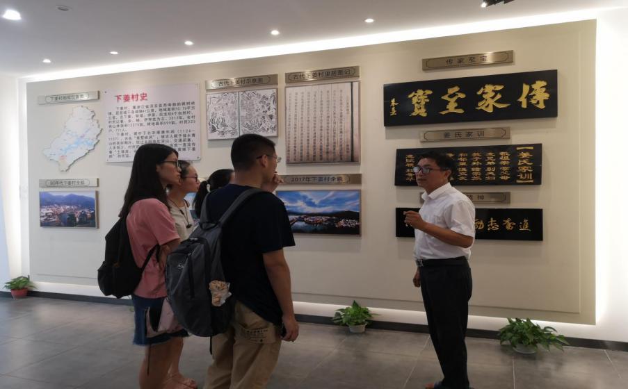 2018年7月23日,我们到达下姜村。简单的安顿后,暑期实践团成员来到了此次下姜村学习交流之行的第一站――下姜村村民委员会。下姜村的村委干部热情接待了我们,并就接下去三天的调研安排进行了简单的沟通交流。随后,在姜书记的带领下,我们参观了下姜村文化长廊。在学习下姜村的发展历史中,我们一行人认识到习近平总书记和张德江委员长对下姜村的经济及人文的发展起到了极为关键的作用。走进长廊,映入眼帘的就是习总书记在2005年至2017年间写给下姜村的4封信,这四封信见证了下姜村从经济落后的小山村走进绿水青山与经济建设共同发展的好时代。
