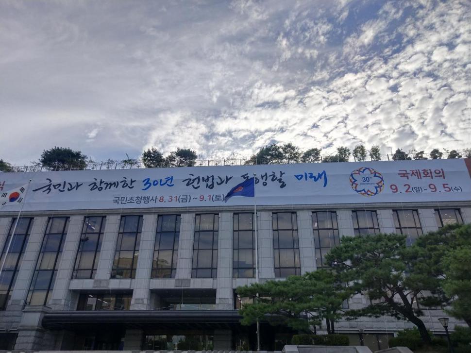 下午,同学们参观访问了韩国宪法法院。宪法法院的金成珍研究官为同学们进行了韩国宪法主题的讲座,介绍韩国宪法的基本情况、韩国宪法的历史渊源及内容、韩国宪法法院的职能、人员构成以及重大的违宪审查案件等。