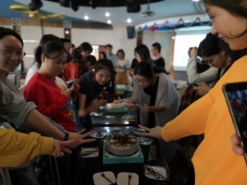 轻松温馨的氛围很快冲散了老师和同学之间的距离感,生日派对进入高潮。寿星们一起唱起生日歌,双手合十,默默许下自己的心愿。随后,伴着掌声和欢笑大家一起吹灭了蜡烛。美味精致的蛋糕让同学们惊叹不已,老师们亲手为同学们切开蛋糕,一块块分发给在场的寿星们。边吃着蛋糕,边谈论着课程学习和生活,大家脸上洋溢着幸福的微笑。