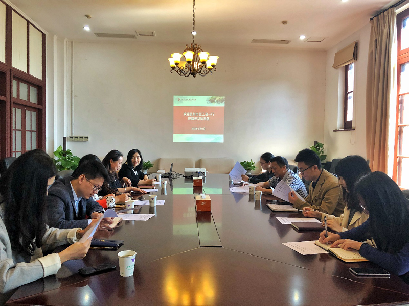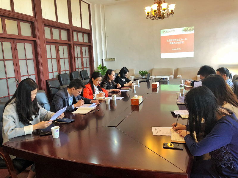 2018年10月11日,“尊法守法・携手筑梦”法律服务行动之走进浙大工作推进会在浙江大学之江校区举行。杭州市总工会劳动关系部部长袁野,副部长焦利芳,主任科员陈杰,浙江大学工会副主席林俐,校工会办公室副科职秘书楼华,光华法学院党委副书记、工会主席吴卫华,光华法学院党政办主任、工会委员陈思,光华法学院团委副书记、工会委员王书剑,光华法学院机关工会副组长袁艺榕、柴烈出席会议。