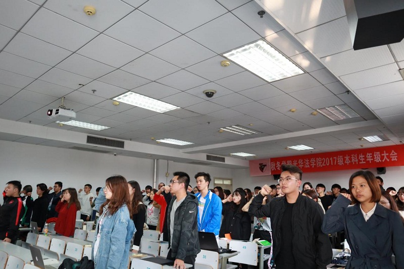“明礼修身,强健体魄;博采众长,志存高远;尊师敬友,厚积薄发;德法兼修,信仰法治;谨记‘求是厚德 明法致公’之院训;投身实现中华民族伟大复兴的中国梦,为法治之昌明、人民之福祉努力奋斗”,在光华法学院学生会主席张楚翘学姐的带领下,全体2017级法学生庄严宣誓,同学们举起右拳,表明决心,铿锵有力的宣誓声在整个教室之中久久回荡。