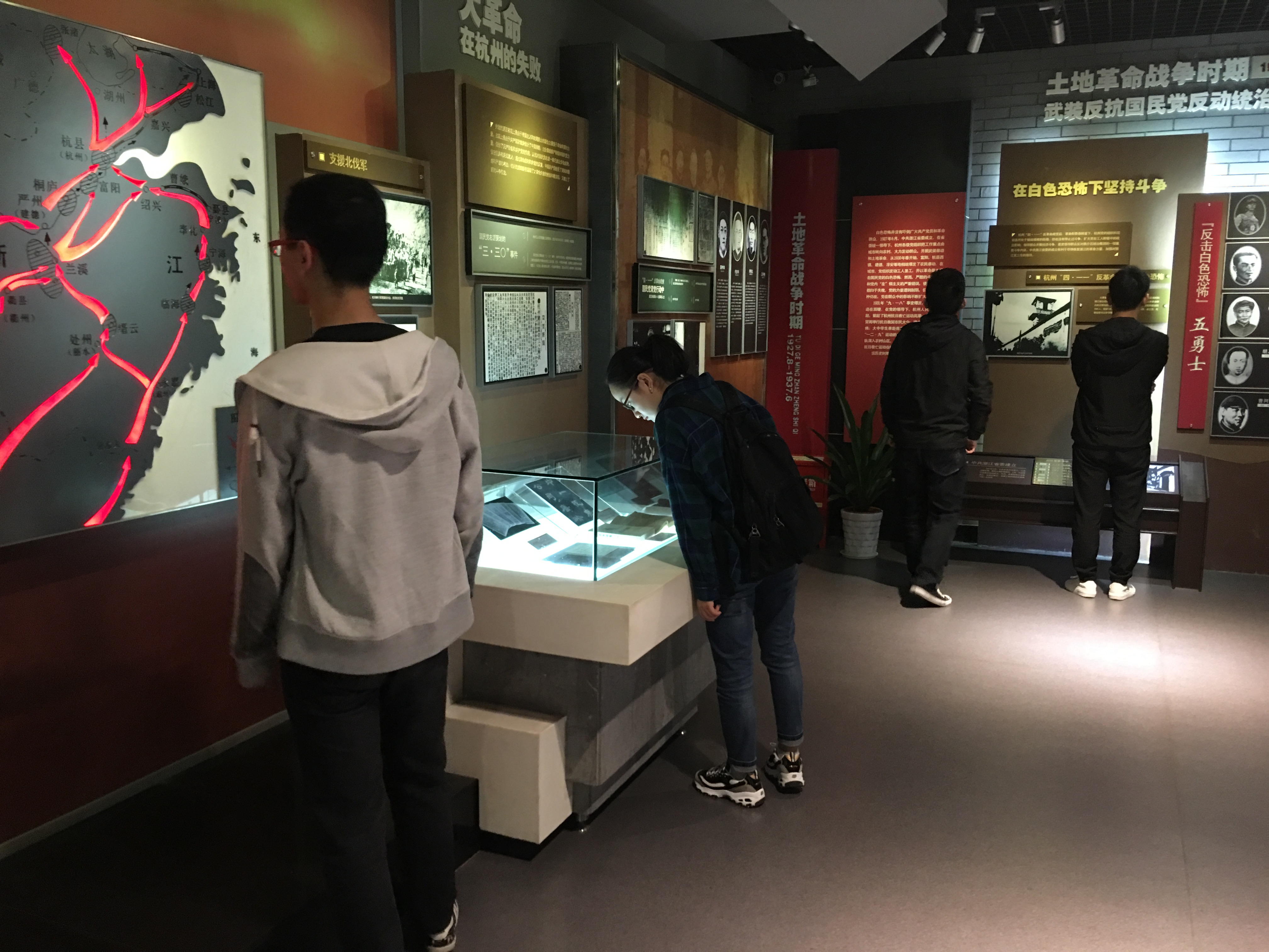 杭州市革命烈士纪念馆内的陈列,以时间为主线,讲述了从杭州的五四运动开始,直至杭州解放期间所发生的一系列爱国运动以及为此牺牲的革命烈士。纪念馆内的图片与文字详细记录了在杭州发生的各种运动与斗争,如:五四运动、新文化运动、杭州工人运动、萧山衙前农民运动、国民革命运动、声援“一二・九”运动等等。许多运动和革命斗争我们都耳熟能详,但对于发生在杭州的具体斗争情况,许多同学第一次有了详细的了解。同学们怀着一种庄严肃穆的心情认真观看,看着墙上一张张年轻的照片,内心极其沉重,他们的生命刚刚开始绽放,就已经停止在为了国家和民族的斗争中,甚至,有更多的人连照片都未曾留下。然而,他们英勇斗争的形象与甘愿牺牲的精神永远是党历史上不可磨灭的记忆。