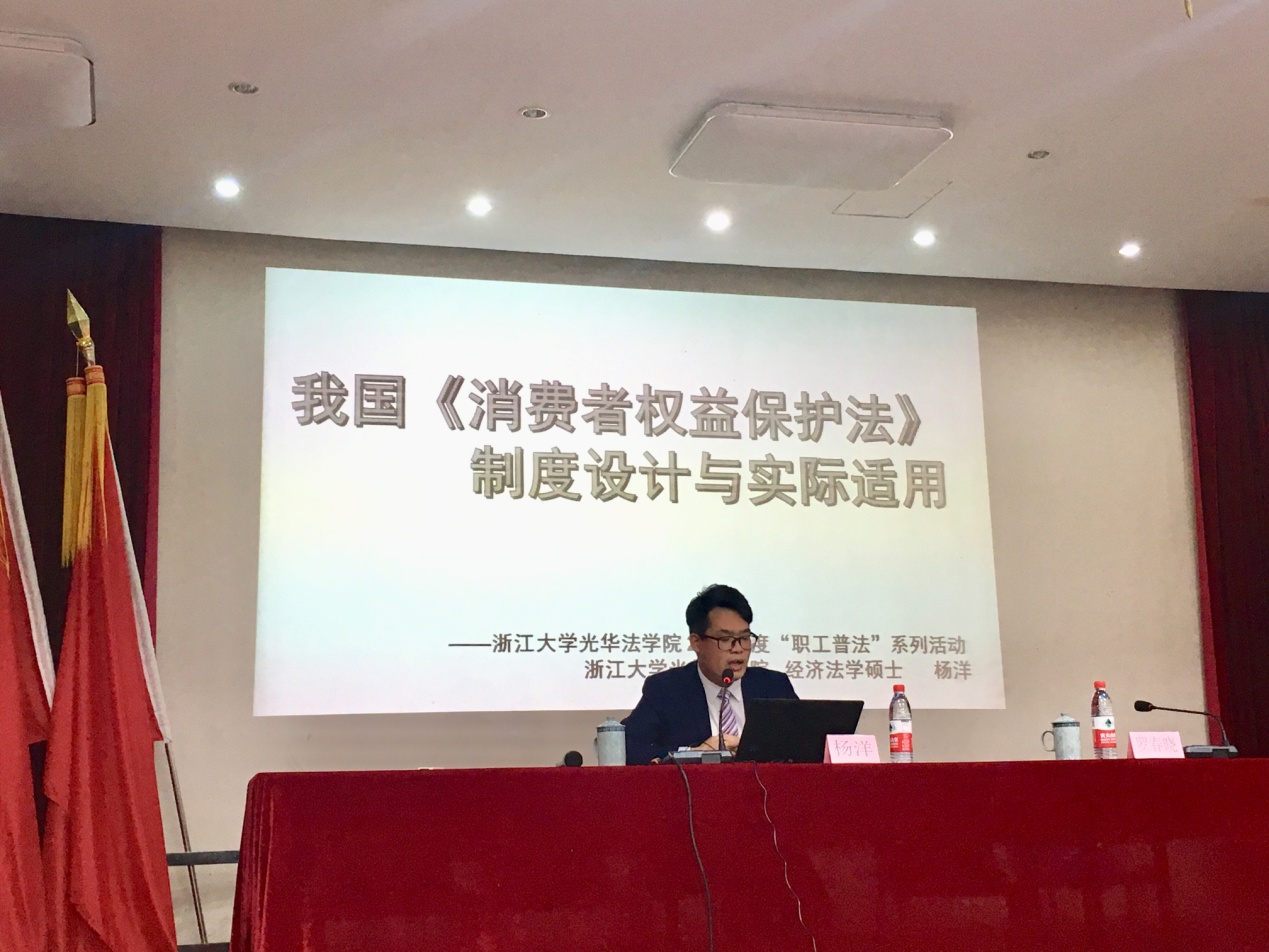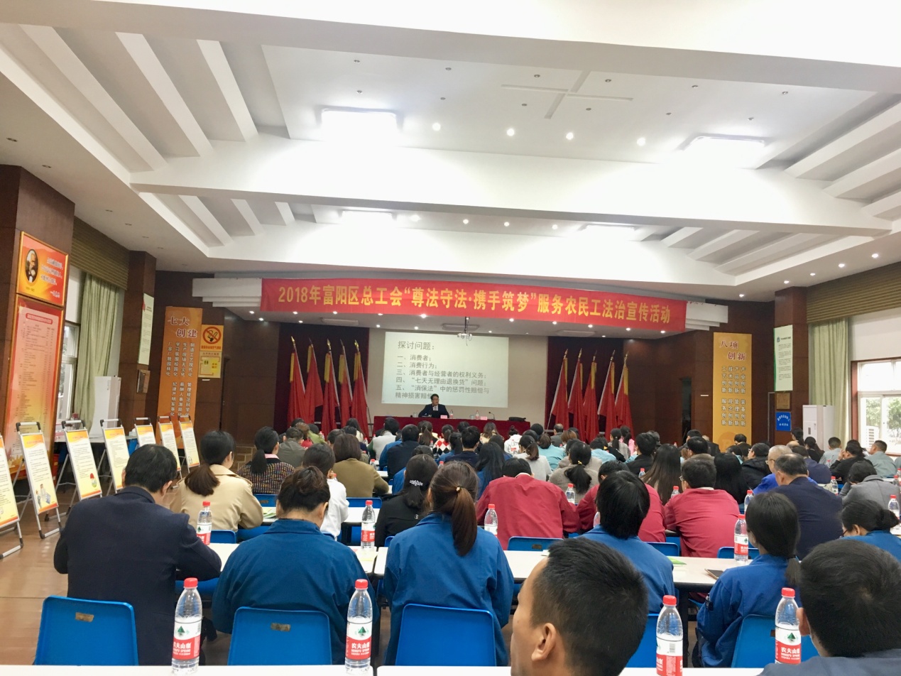 在中华全国总工会和教育部《关于开展2018“尊法守法 携手筑梦”服务农民工法治宣传行动的通知》以及浙江省总工会《关于持续推进“尊法守法 携手筑梦”浙江工会法律服务行动的通知》等文件的号召下,2018年11月16日下午,杭州市总工会、富阳区总工会携手浙江大学光华法学院、浙江大学学生法律援助中心开展了一场以“消费者权益保护”为主题的普法宣传讲座。