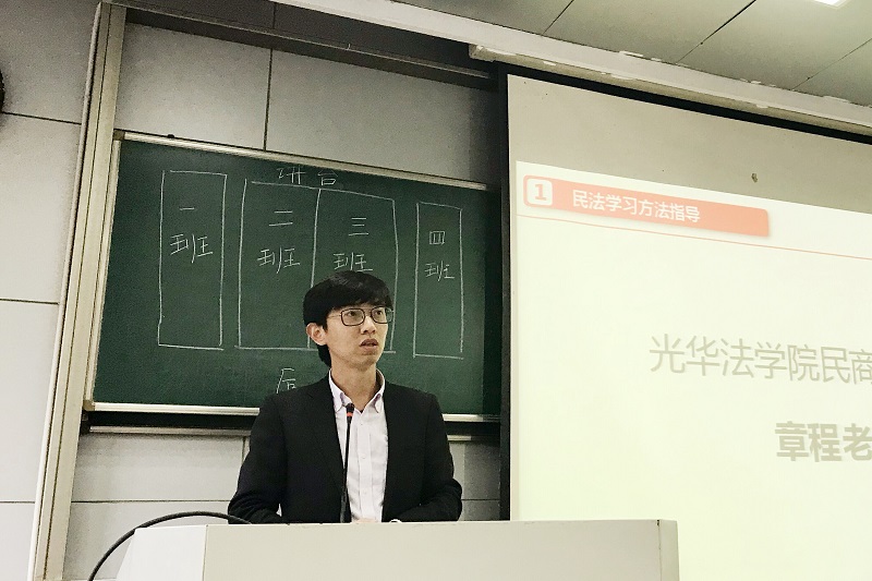 浙江大学光华法学院民商法研究所的章程老师将其对于同学们日后法学学习上的期待和指导娓娓道来。在大学学习的心态方面,他希望无论是本科一年级还是高年级的同学,都应始终保持一颗宽厚的心,不能够只局限于未来个人的温饱问题甚至为此而产生焦虑感,应当将目光放得长远一些,要从世界看自己,从时代看自己,而非从自己来看世界,看时代。在学习方法上,章程老师则认为应当拒绝“问什么答什么”这样的模式,认为大学生应当多加独立思考,独立探索,形成自己的观点。同时,大学生在本科阶段应抓住机会接受多元化的知识,不自我设限,只有如此才能够让不同领域的知识碰撞出火花。章程老师还强调阅读的重要性,关于民法学习则建议通过做一定的题目来提升自己的分析能力。章老师的讲话有条有理,从容不迫,将大小道理贯穿其中,令同学们受益匪浅。