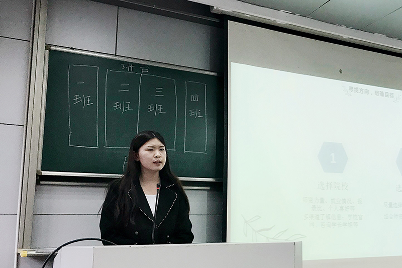 18级科硕的杨晓菲学姐向大家进行了考研经验的分享。她从明确目标、专心复习、调整心态三个方面为同学们指点迷津,在同学们关于考研院校和专业的选择上也给了许多建议,在备战考试的技巧和经验上将自己的曾经的所得所感向大家一一讲述,让同学们对于考研有了更加准确的认识。