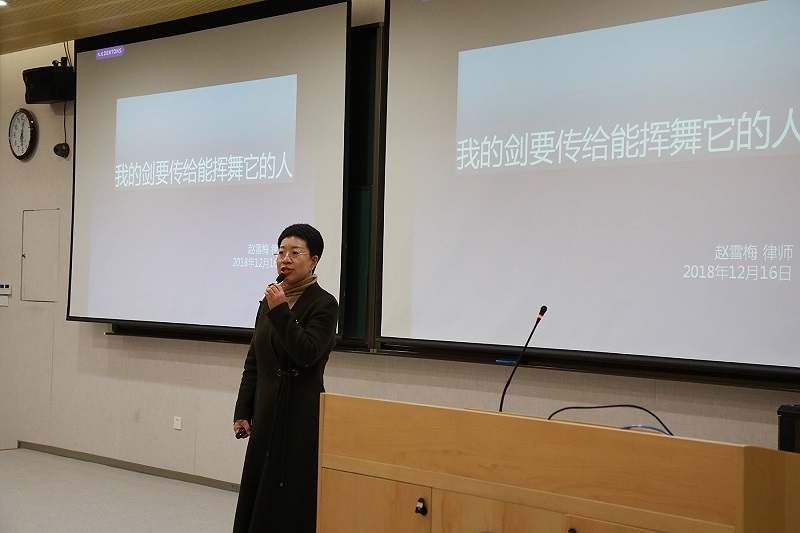 “我的剑要传给能挥舞它的人”,赵雪梅律师站在律所合伙人的角度告诉同学们,法律是一个法律人保护企业正当权益的黄金铠甲,我们需挥舞好手中的剑,做对他人和社会真正有价值的事。她提出,不合格的继承人是懒惰的、反复无常的、自私的、有着不良嗜好或容易心怀怨恨的,而真正的继承人应该是终身学习、高度自律、内心平和、正念利他之人。在谈及律师应具备的职业知识时,赵雪梅律师说,作为成熟的律师,在商业活动中应该扮演一个设计者的角色,应该具备法学、会计学、心理学、数学、物理学知识,拥有综合思维。对当下大热的人工智能问题,赵雪梅律师也提出了自己的见解:随着科技的发展,智能合约、智能法律顾问中心纷纷出现,我们这一代的法律行业必将受到科技的强烈冲击,我们未来的对象可能会变成具有强大数据库和学习能力的机器人。在此情形下,律师需要成为智者,因为只有人的感情和人的整体学习能力是不会被机器所取代的,需要更加努力地学习和适应新变化。最后,赵雪梅律师提到,法律人能够体验一百种人生,是相当精彩的,也希望同学们更加努力,早日成长为合格法律人。