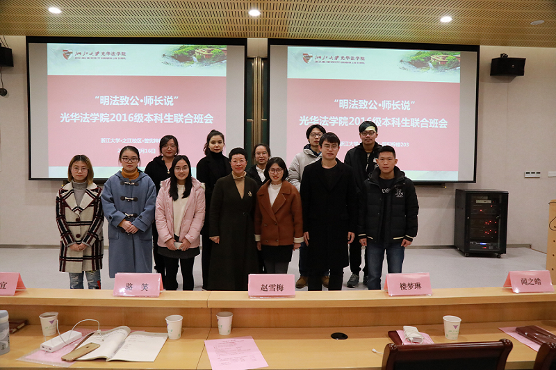 2018年12月16日晚6点,光华法学院于曾宪梓教学楼203室举行了“明法致公・师长说”2016级分享会。北京大成(杭州)律师事务所合伙人赵雪梅律师、学院17级研究生闻之皓及15级本科生胡相宜、杨佳凝到场与16级同学们分享从业经验、保研考研心得并亲切交流。分享会由16级本科生祖母来提主持。光华法学院团委副书记骆笑、本科生兼职辅导员楼梦琳学姐亦亲临现场参加。