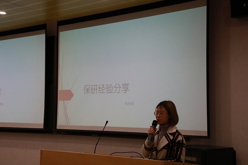 杨佳凝学姐则向同学们详细介绍了今年学院的保研情况并强调学业成绩一定是重中之重,大三学年的成绩也极为重要。她希望同学们可以了解自己的位置,对自己有明确的地位,清晰规划自己选择的方向。