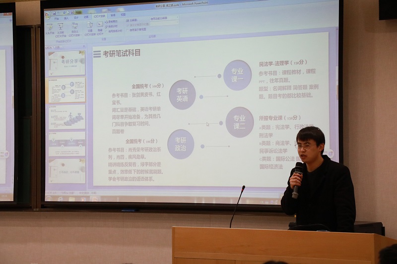 胡相宜学姐则分享了自己选择保研的心路历程。“为什么选择法学?今后想成为什么样的人?应该怎么做?”对于这法学院三问,她认为,不知道为什么想学时,应当给自己一个动力和一个理由,既已选择成为法律人,就继续下去,多一份社会责任感,将自己能做的做到最好。