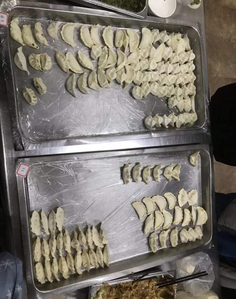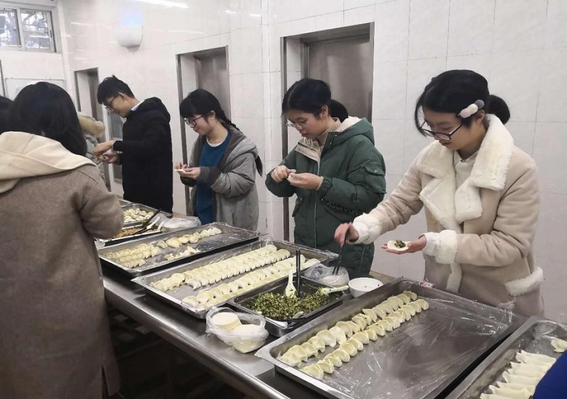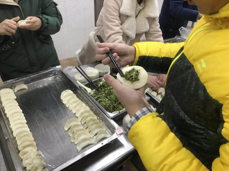 在食堂师傅的示范和指导之下,同学们大展身手,快速地搅拌着馅料,擀制出一张张饺子皮。在包饺子的同时,同学们也发挥着奇思妙想,于是元宝样的、太阳般的、船型的、柳叶边的各式各样的饺子诞生了。不同形状的饺子体现着东南西北的地域差异,也体现了之江一家人的幸福,包饺子现场气氛欢快,好不热闹。