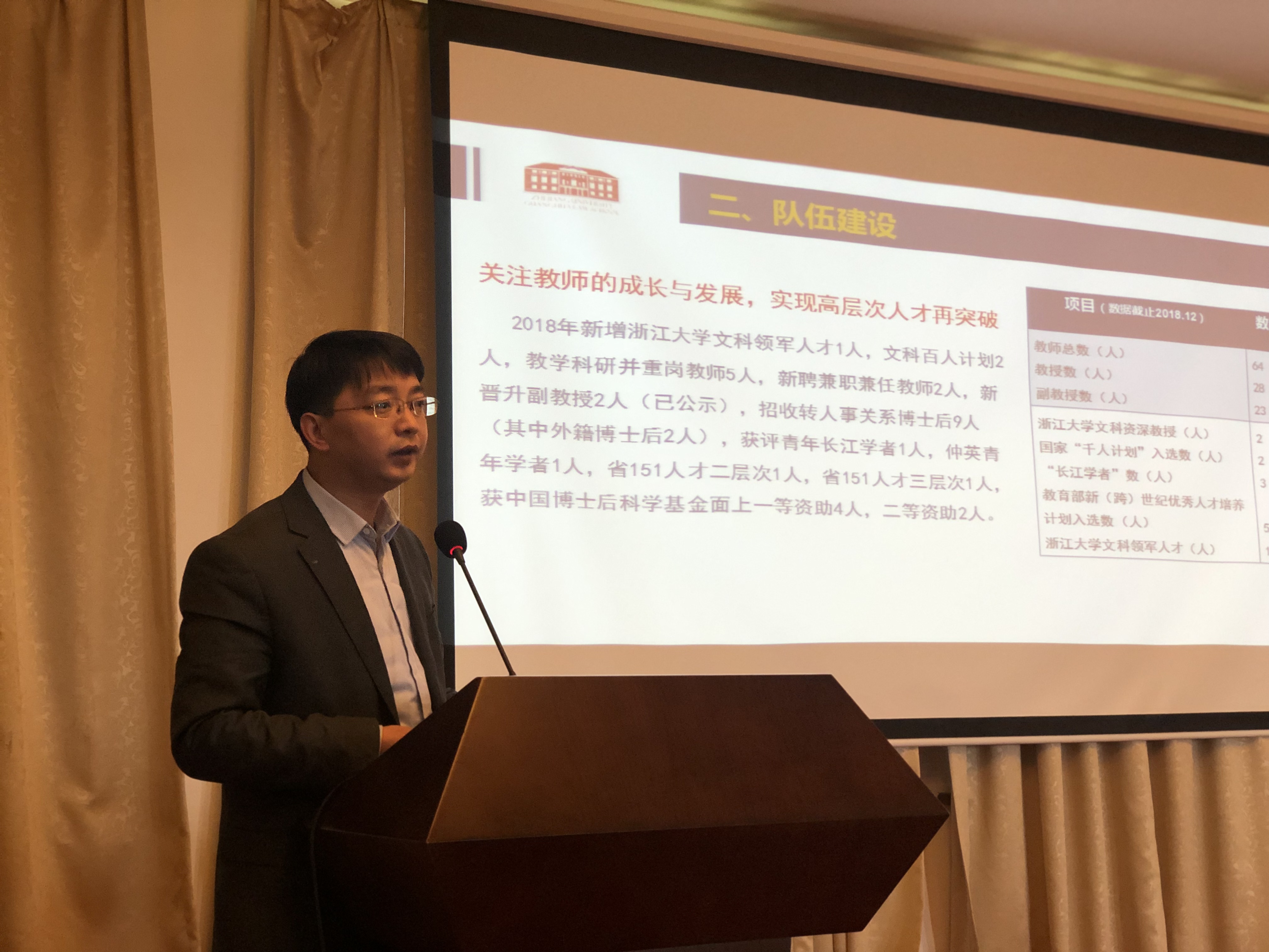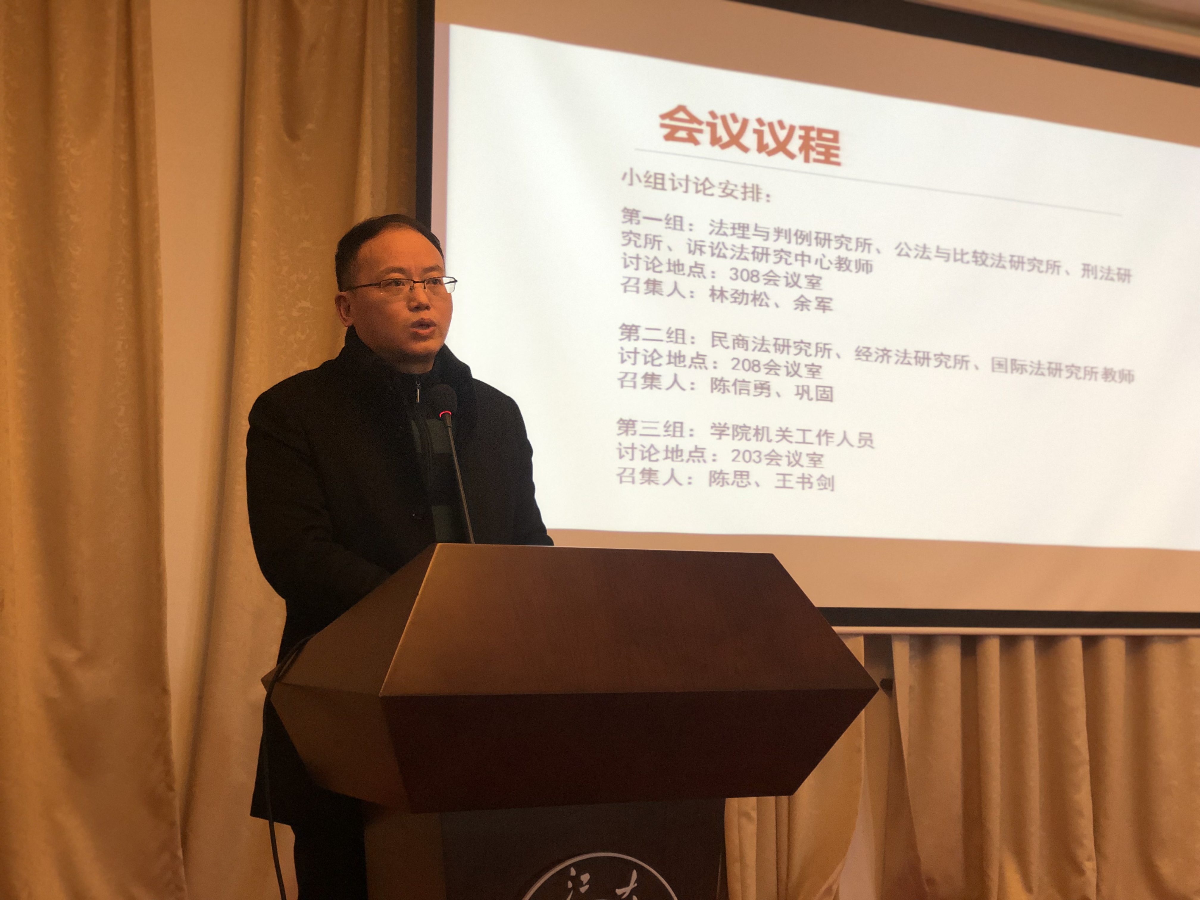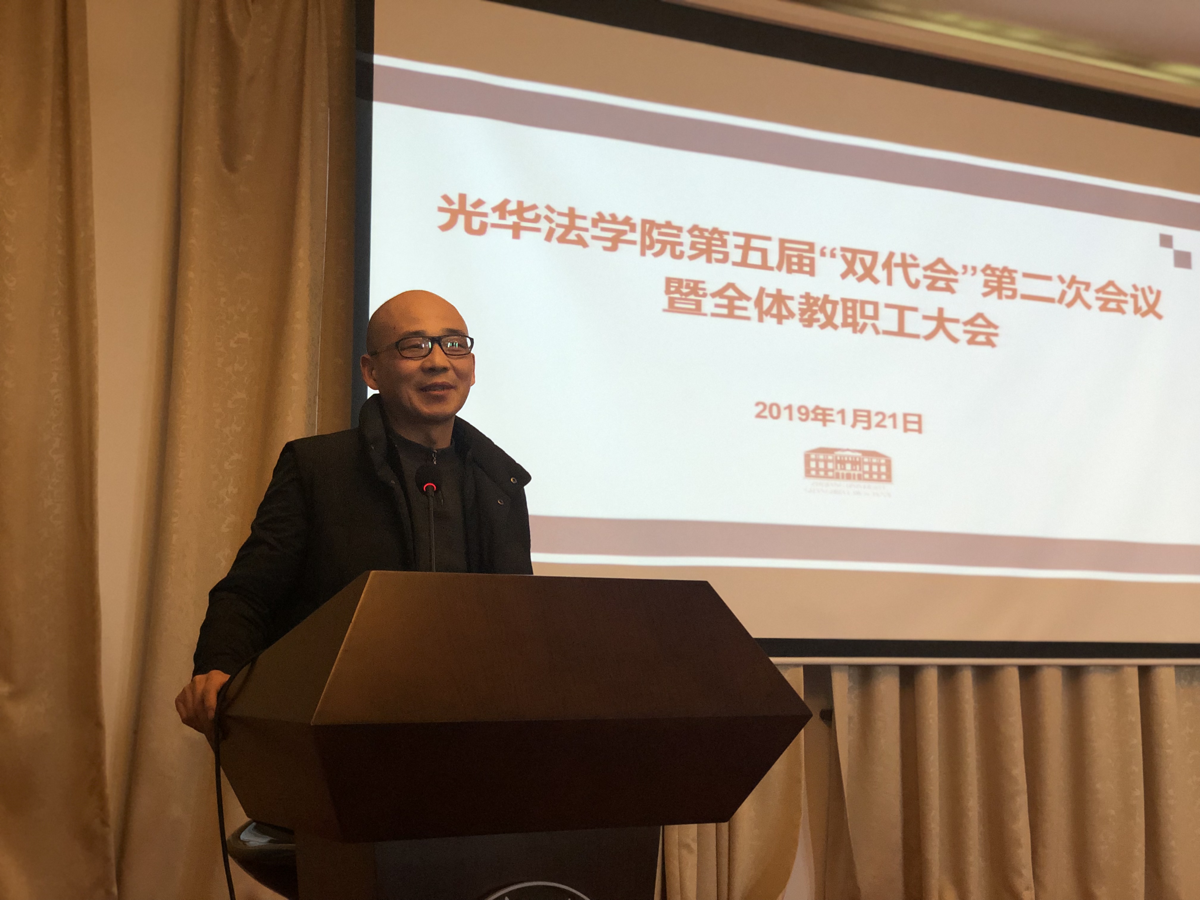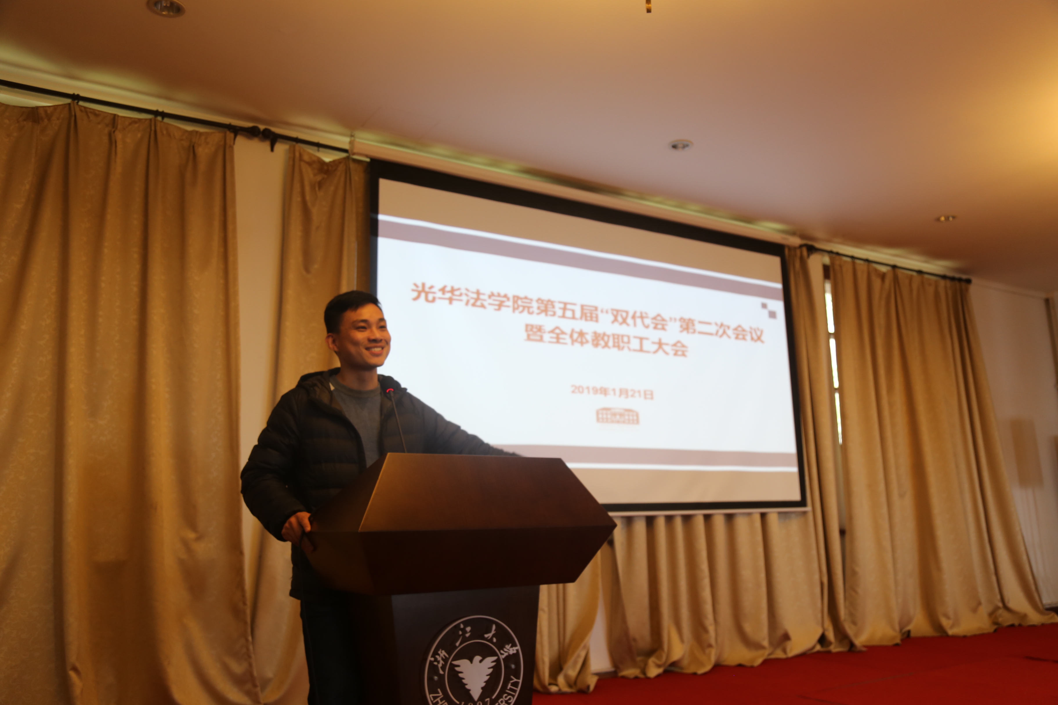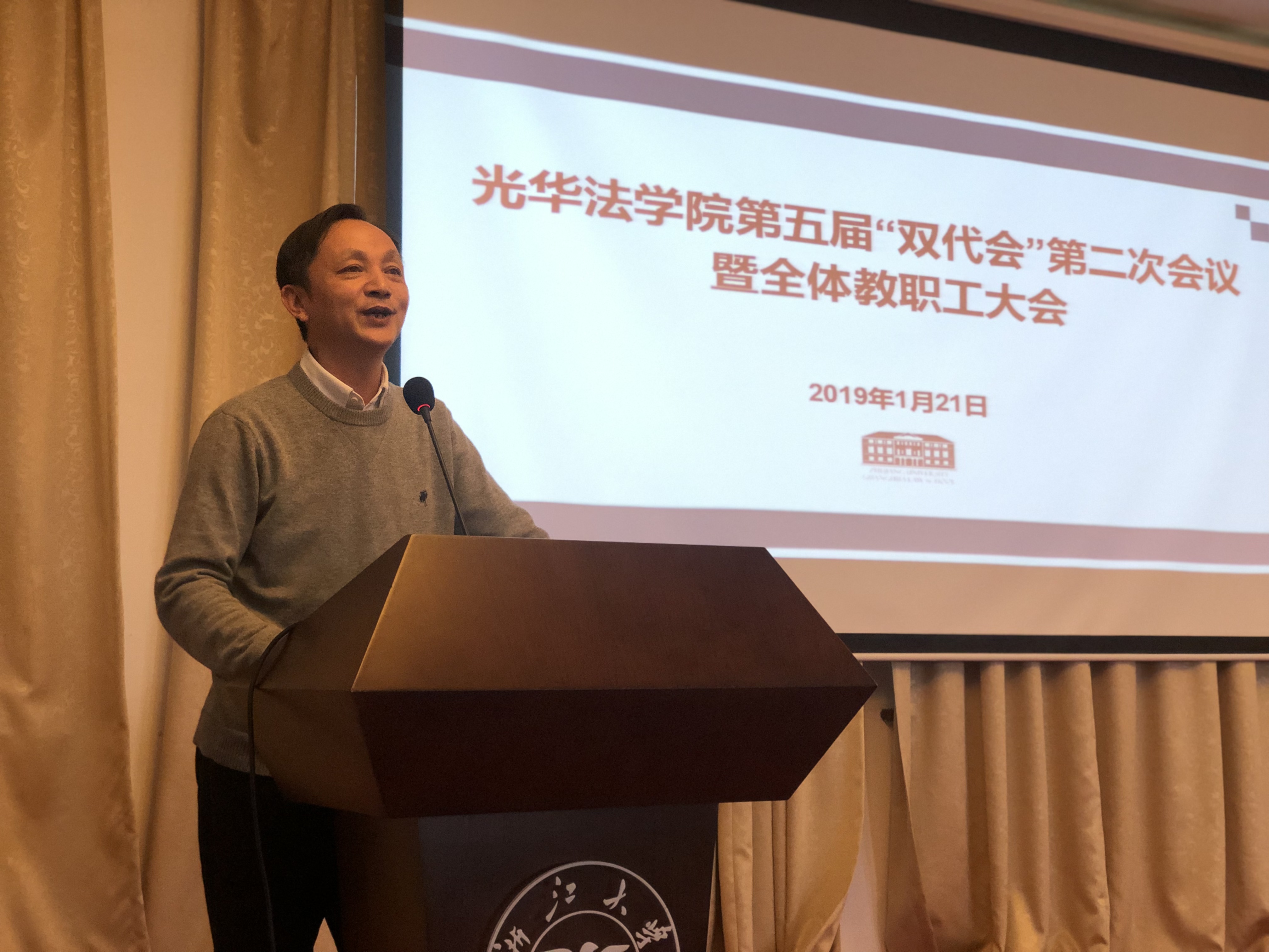 会议第一阶段由学院党委副书记吴卫华主持。吴卫华副书记介绍了学院2018年度新入职教工,并宣布大会开始。周江洪常务副院长作学院工作报告,全面回顾了过去一年的工作:2018年学院实施“双一流”规划,“人工智能与法学”建设成效初显;“以评促建”规范教学管理,多举措提升学生实践能力;坚持全员协同思政育人体系,推进思政工作创新平台建设;关注教师的成长与发展,实现高层次人才再突破;重大项目立项创历史新高,学术研究平台强化升级;对标国际一流合作伙伴展开合作,国际化办学水平快速提升;凝练出一批精品培训项目,社会服务能力不断增加;建设一流的支撑体系,持续推进发展联络工作。并展望了2019年工作重点。