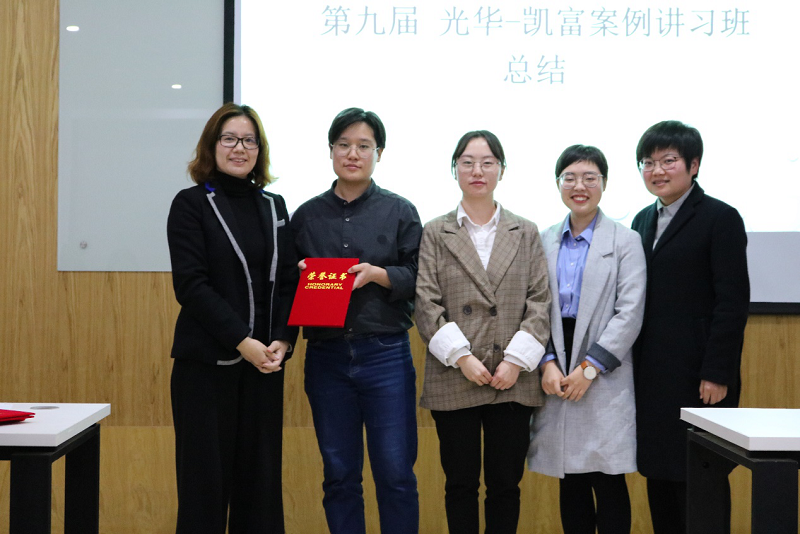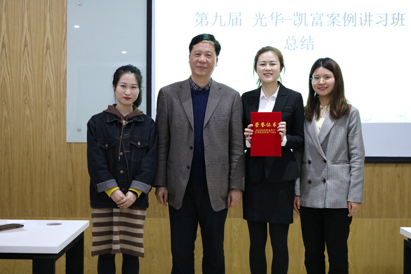 (姚启明律师与优胜奖得者(孙雨乐、杨晓菲、李枳壑、蒋琳)合影留念)