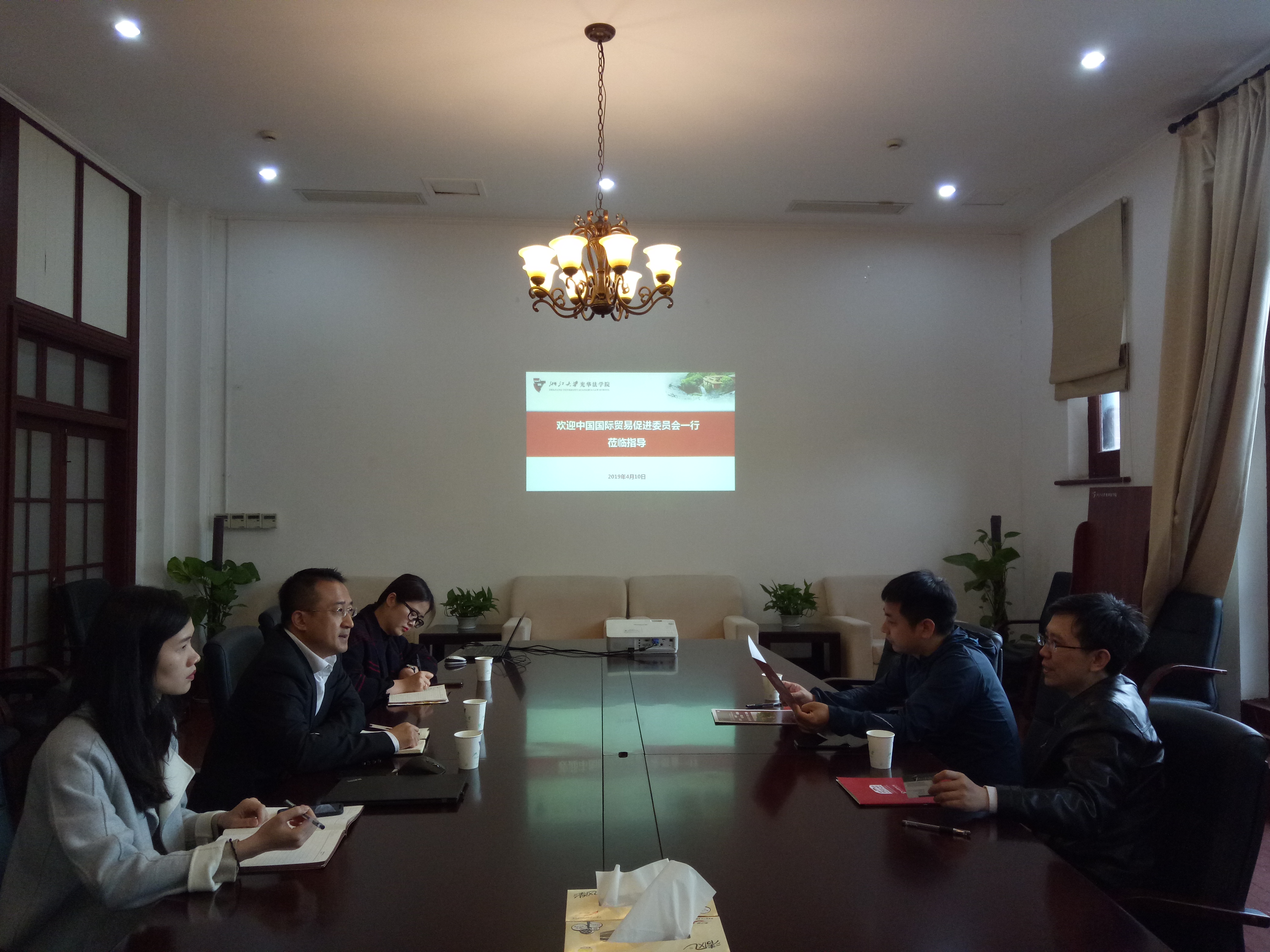 2019年4月10日,中国国际贸易促进委员会法律事务部郑伟处长来访我院,我院副院长赵骏教授、办公室陈思主任和袁艺榕老师及外事科洪佳颖老师参加了此次面谈。会议安排在主楼208室举行。