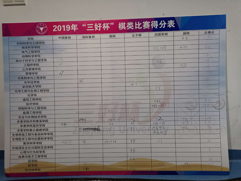 2019年4月14日,浙江大学“三好杯”棋类比赛落下帷幕。此次比赛共设中国象棋、围棋、国际象棋、四国军棋、跳棋、五子棋 等六项比赛,吸引了全校500余名选手参赛,我院选手参加了其中除四国军棋外的五项比赛。