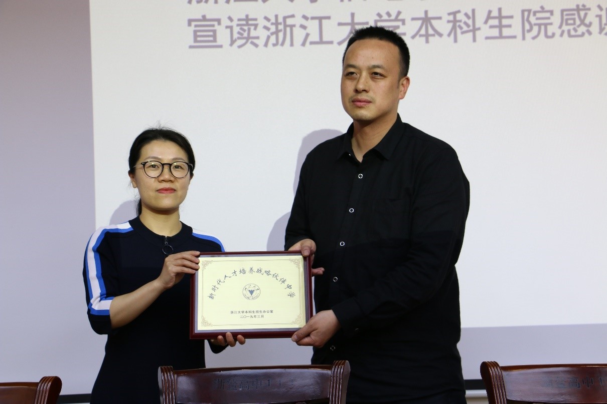 在瓯海中学的报告厅里,宣讲组的赵蕾蕾老师代表浙江大学宣读了感谢信,并与瓯海中学举行了新时代人才培养战略伙伴中学授牌仪式。随后,郑春燕老师向广大瓯海高中学子进行了“从浙里出发”的主题报告,介绍了浙江大学的学科优势、人才培养、升学就业以及浙江大学的学习、生活情况等同学们共同关心的内容。郑春燕教授在报告中指出“国家之未来,在于人才之培养”,浙江大学的“大楼”、“大师”培养的不仅是为了实现浙大人的个人卓越人生,更要培养的是“公忠坚毅、担当大任、主持风气、转移国运”的高素质领导人才。
