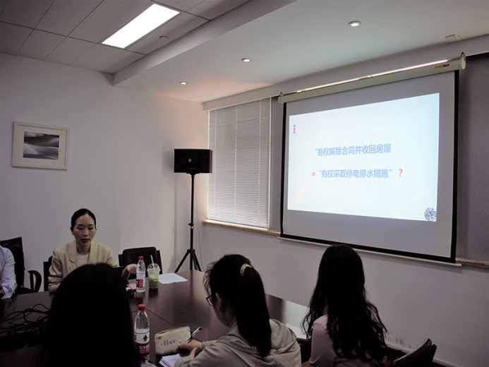 本次的课程主要针对租赁合同纠纷中的实务问题。主讲人给大家带来的第一个探讨点是在承租人有欠费、逾期不搬离、违规装修等违约行为时,出租人能否采用断电断水的方式加以应对。在现场,经过律师们的鼓励,同学们也进行思考并提出了自己的想法。在听完同学们的观点后,主讲人稍加点评,同时分析指出合同中的要点,即对“有权解除合同”是否当然地等同于“有权停电停水”的认定。随后,主讲人介绍道,在合同没有明确约定的情况下,法院一般会认定出租人停电停水的行为明显超出私力救济的范围,属于权利的滥用。而在合同中有明确规定的情况下通常则视为双方的真实意思表示和约定,行为合理